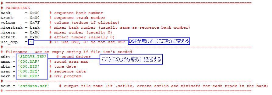 また、DSPプログラムを使用しない音楽もありますが、ない場合はそのまま無しで大丈夫です。ただし ssfmake.pyに記述しなくてはいけません。